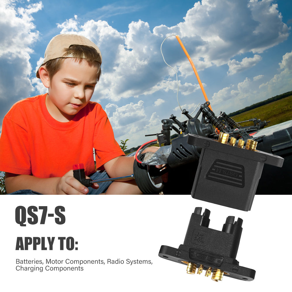 The QS7-S is a medium-sized high-current connector designed for stable power transmission in demanding applications. Rated for continuous current up to 70A, it features gold-plated copper contacts and a flame-retardant nylon housing for enhanced electrical conductivity and durability.